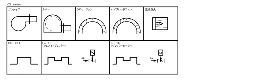 <KGシリーズ> はガスバーナーのシリーズの中で最も機種が多く、最小は23kW(KG-2C)から、最大は約700kW(KG-61V)までを揃えています。 運転制御はシンプルなON-OFF制御を基本に、独自開発のダンパーソレノイド(WE仕様)、ダンパーモーター(WEM仕様)によるエアー量調整に電磁弁の入切を合わせてガス量を可変するLo-Hi制御があります。ガス種は LPG・13A のほか、一部 6C に対応します。(KG-5T~21T)